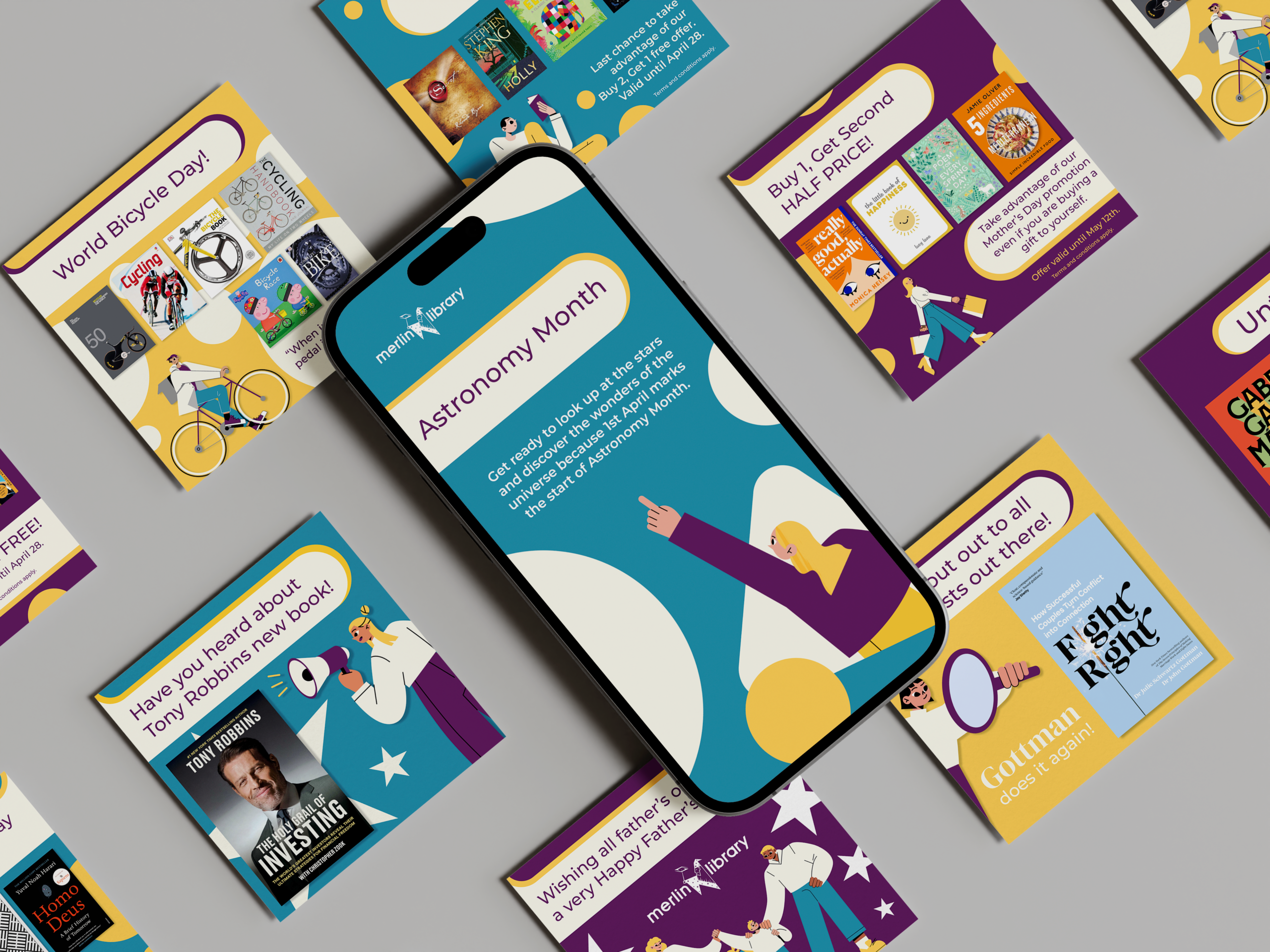 Avenir Studio collaborated with Merlin Library to enhance its brand presence through engaging advertisement artwork, a custom illustration library, and cohesive print materials. We also managed their social media, creating compelling posts and animated reels to boost engagement. Our work ensured a consistent and visually appealing brand experience across multiple platforms.